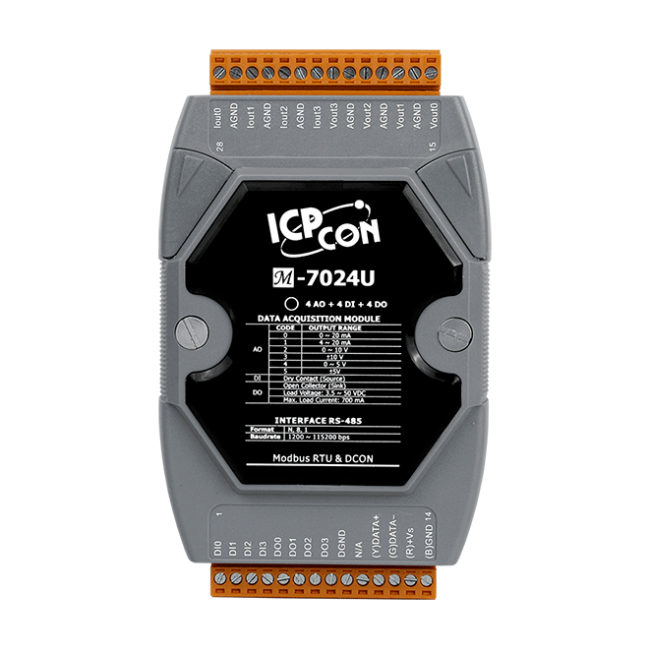 M-7024U/M-7024UD 是一個多功能模組,具有 4 個類比輸出通道、4 個數位輸入通道、4 個數位輸出通道。所有類比輸出通道皆提供可編程的輸出範圍(0 ~ 5 V、±5 V、0 ~ 10 V、±10 V、+4 ~ +20 mA 或 0 ~ +20 mA),且每個類比輸出通道皆可設定單獨的範圍。M-7024UD 有 12 個 LED 指示燈,可用於監控輸入/輸出通道的狀態。M-7024U(D) 皆支援 Modbus RTU 和 DCON 通訊協定,可由軟體設定,還有設定上電值和安全值的選項。模組每個通道對於 +4 ~ +20 mA 輸出,都具有斷線檢知功能,還具備 8 kV ESD 防護和 2500 VDC 模組內部隔離。