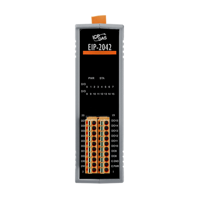 EIP-2042是一個16通道的數位輸出模組。模組類型為EtherNet/IP的從端,使用者可以藉由觀察模組上的LED指示燈來確認連線狀態,及數位輸出狀態,泓格更是提供了免費的應用工具軟體來設定及測試EIP-2000模組。