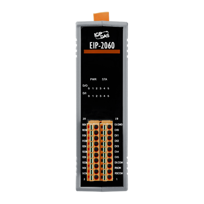 EIP-2060是一個6通道數位輸入及6通道繼電器輸出模組。模組類型為EtherNet/IP的從端,使用者可以藉由觀察模組上的LED指示燈來確認連線狀態,及I/O狀態,泓格更是提供了免費的應用工具軟體來設定及測試EIP-2000模組。