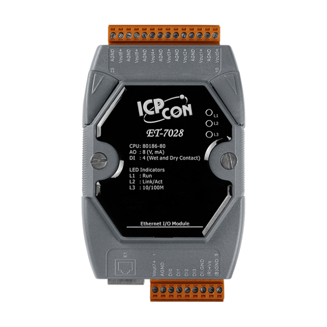 ET-7028 是一款多功能模組,配有 8 個類比輸出通道。該模組提供多種可編程的類比輸出選項 (+/-5 V,+/-10 V,0 ~ 20 mA 與 4 ~ 20 mA),且每個類比輸出可依據 Jumper 對應的位置,來編程為電壓或電流輸出。ET-7028 完全符合 RoHS 環保規範,並具有 4 kV ESD 保護和 2500 VDC 模組內部隔離。